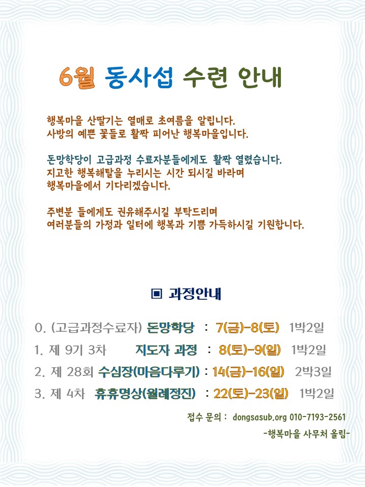 두달만의 지도자과정, 수심장, 휴휴명상등이 함께 준비 되어있으니 권선 부탁드립니다.